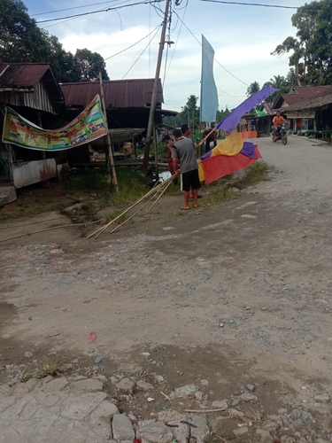 Pak Mayadi dan kawan kawan memasang bendera umbol umbol untuk persiapan peringatan Maulid Nabi di desa sarang burung Danau kec. Jawai kab. Sambas. Kalbar.Jum'at, 30/10/2020