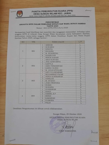 PPS Desa Sungai Nilam Kec. Jawai, Kab. Sambas mengumumkan hasil seleksi pendaftaran calon anggota KPPS. Jumat,30/10/2020