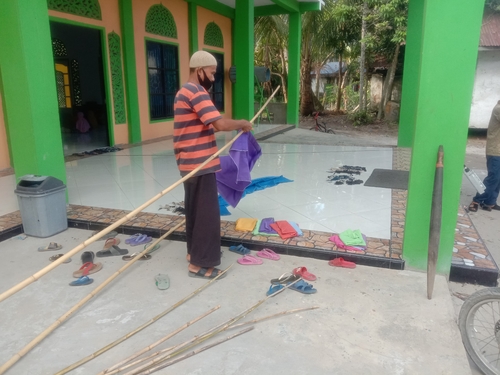 Pak misran menyiapkan bendera untuk acara persiapan menyambut maulid nabi di masjid mujami'ul muslimin di desa sarang burung danau kec. Jawai. Kab. Sambas. KalbarJum'at, 30/10/2020
