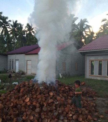 Masyarakat Desa Sarang Burung Danau Kec. Jawai. Kab. Sambas, Kalbar membakar tempurung kelapa untuk membuat arang lalu dijual ke pengepul, Jumat (30/10/2020).
