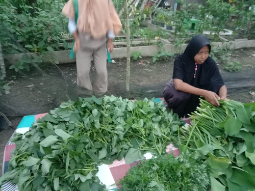 Winda memanen sayuran bayam potong dan genjer di kebun pangan mandiri, Desa Simpang Heran, Kec; Air Sugihan, Kab; Ogan Komering llir, Sumatera Selatan. Selasa 27/10/2020.