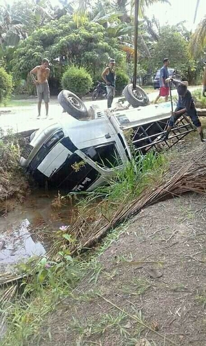 Akibat jln sempit dan rusak sebuah mobil bak terbuk terperosok di parit sungai segajah makmur-kubu-,rohil terperosok ke parit