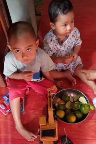 Adek abiyu sedang menikmati jeruk di Desa Sarang Burung Danau. Kec. Jawai. Kab. Sambas. Prov. Kalbar. Selasa (27/10/2020)