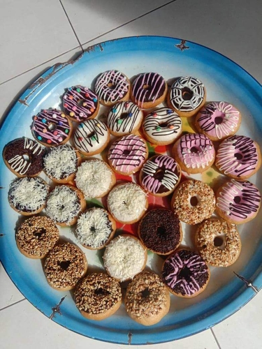 Epi menjual donat dengan berbagai varian rasa di Desa Sarang Burung Danau, Kec. Jawai, Kab. Sambas, Kalbar. Selasa,27/10/2020