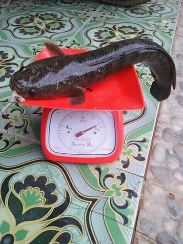 Samadi menimbang ikan gabus yg barusan ia tangkap memakai pancing diparit sebelah rumah didusun sentosa-sungai segajah makmur-kubu-rohil selasa 27/10/2020