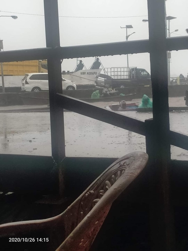 Hujan dan angin kencang melanda sungai sambas besar, aktivitas penyebrangan dihentikan sementara di dermaga perigi piyai Kab. Sambas, Kalbar. Senin,26/10/2020