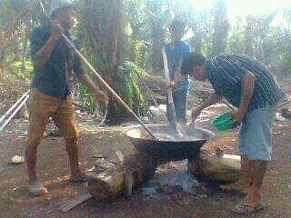 Sutarmin memilahkan kerak dodol untuk dibuang agar dodolnya bagus,sungai segajsh makmr-kubu-rohil,senin 26/10/2020