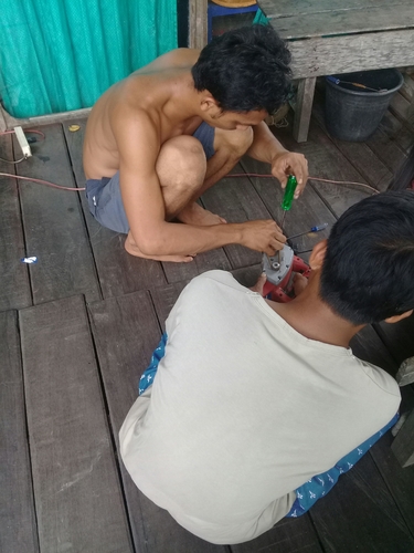 Bapa adul dan bapa ijai sedang memperbaiki mesin katam nya karna ad kendala. Senin (26/10/2020)