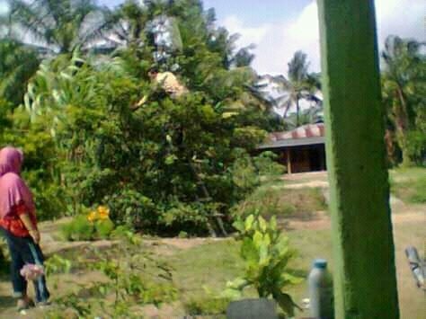 Nampak dari kejauhan seorang ibu mengawasi anaknya yg sedang memanjat pohon untuk mengambil buah,sungai segajah makmur kubu,rohil,senin 26/10/2020