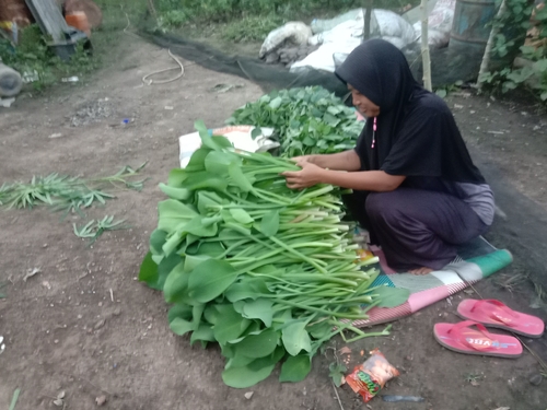 Nur aida sedang merapikan sayuran genjer yang telah di panen di kebun pangan mandiri di Desa Simpang Heran ,kec ;Air Sugihan kab; Ogan  Komering llir, Sumatera Selatan.25/10 /2020.