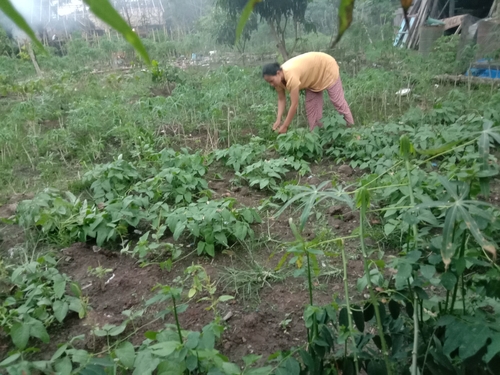 Suminah sedang memetik sayuran daun lembayung di kebun pangan mandiri,di Desa Simpang Heran,kec; Air Sugihan, Kab; Ogan Komering llir, Sumatera Selatan. Minggu 25/10/2020.
