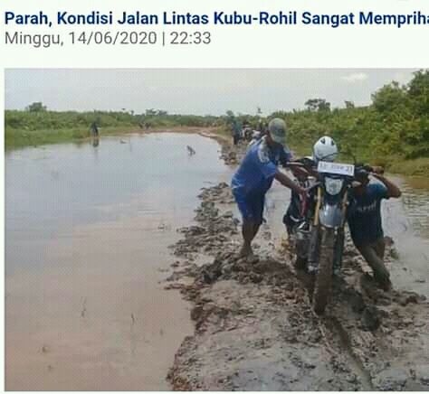 Sucip dan temanya berjibaku menyorong motor melewati jln rusak di lintas pesisir kubu - bagan siapi api rokan hilir riau minggu 25/10/2020