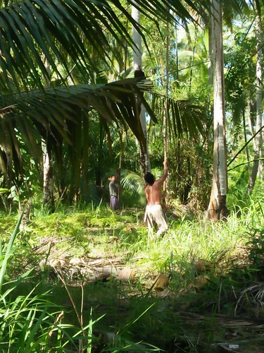 masyarakat mengambil buah kelapa dengan cara menjuluk nya menggunakan arit kelapa,di desa sarang burung kolam,kec jawai,kab sambas,kalbar,Rabu 28/10/2020