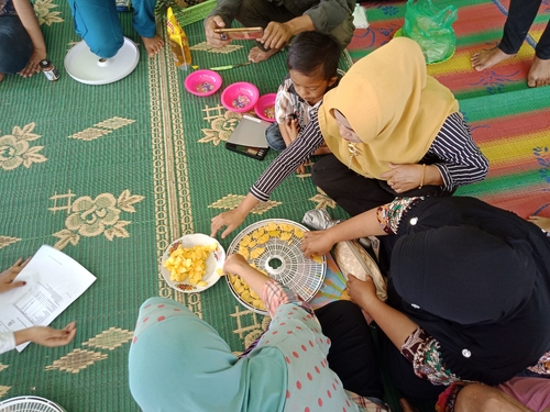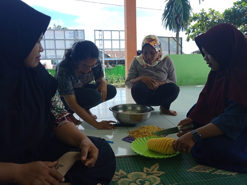 Kegiatan praktek pengolahan keripik dan sambal dari buah nanas didampingi langsung oleh Corazon dari Seniman Pangan Javara di Balai Desa Gandang, Kec. Maliku, Kab. Pulang Pisau, Kalimantan Tengah, Sel ...
